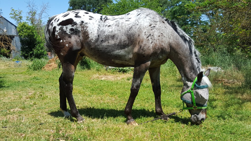 To this day, I do not know if she was lying about the racing, or really was that ignorant. She was so adamant that it’s hard to understand why, if she was not lying. After some back and forth on price, we finally brought that Appaloosa home. One of the first things I did was try to trace the tatoo. There was one number not fully legible – either 5 or 3 – so I submitted both possible numbers. The first being a stallion in the UK, black with blanket, that left the second – God Bless Texas. The previous owner mentioned that one of his past names had been Tex, so that seemed a fit.