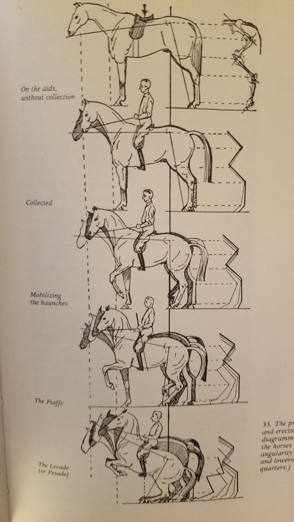 Notice how different the angles behind the horses are between the two versions. Those lines and angles represent the changes in the hind leg angles for the various levels of collection. Note, in particular, how much more shallow the later version represents the piaffe and levade angles. The angles in the older version are more classically correct, and therefore more true to the author’s intent. The version on the right has also removed the first vertical line, meant as a reference to the placement of the horse’s face, relative to the vertical. A minor omission, but still hewing away from the author’s intent.
