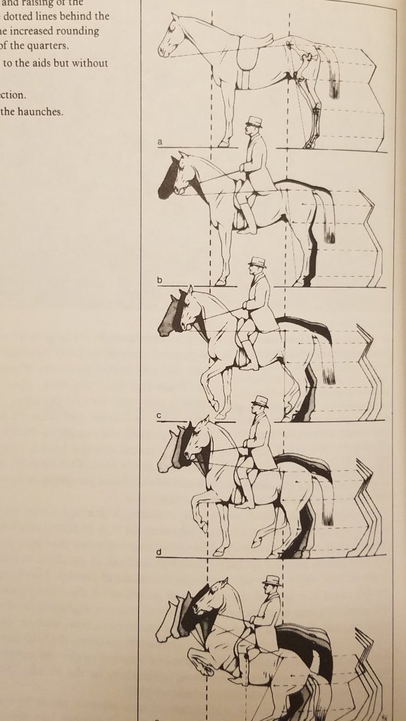 He does go on to describe some control issues such riders might have, if they try to go outside of the horse’s comfort zone – so it is not an endorsement of this riding as something to strive for. He is accepting of the presence of lesser trained horses and riders, but clear about the level of performance one can expect under such conditions. He uses it as a baseline to then discuss what a horseman should strive for and achieve in their riding and training.