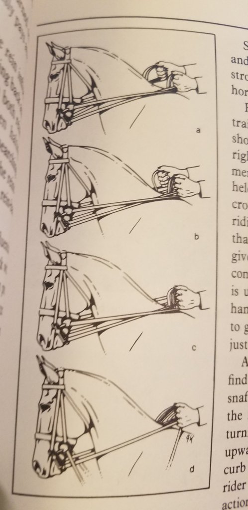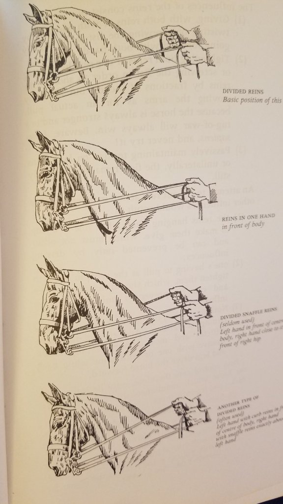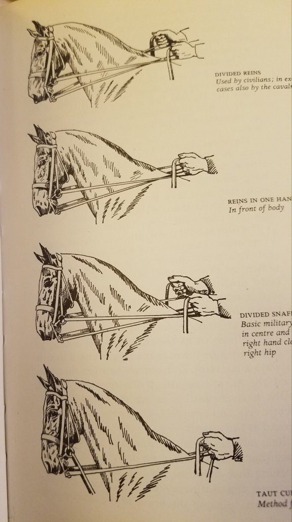 The book is filled with informative drawings and photos in support of the text. It is perhaps the most helpful aspect of the book. However, I recommend older versions of the book for the full experience. I recently purchased a copy of the 1973 edition, which was my original version, for comparison to the 1983 edition I already had, in which drawings were redone. A comparison of the two confirmed what I had suspected – that the changes to illustrations left much to be desired. For example, here are the illustrations on rein holds for the double bridle.